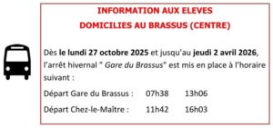Dès le lundi 27 octobre 2025 et jusqu’au 2 avril 2026, l’arrêt hivernal « Gare du Brassus » est mis en place à l’horaire suivant: